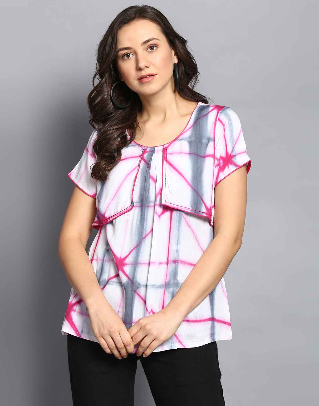 An amazing range of women Tops in soft and solid colors that looks perfect for regular wear. With beautiful designs and patterns, these apparels are very stylish and comfortable too. Get rid of the 'regular' look this season wearing this Top by AMAIVA. Amaiva Women White Tie & Dye Rayon Top. This Short A-Line Top has Contrast Trim Detailing, Couching Detailing with Short Sleeves & Round Neck.