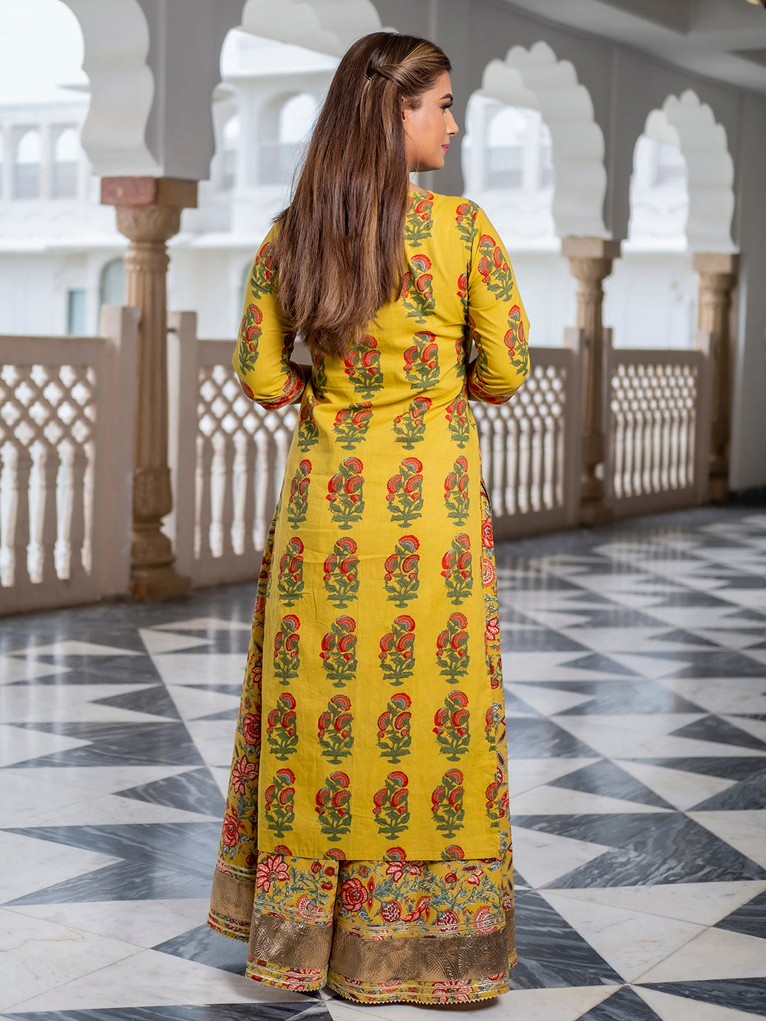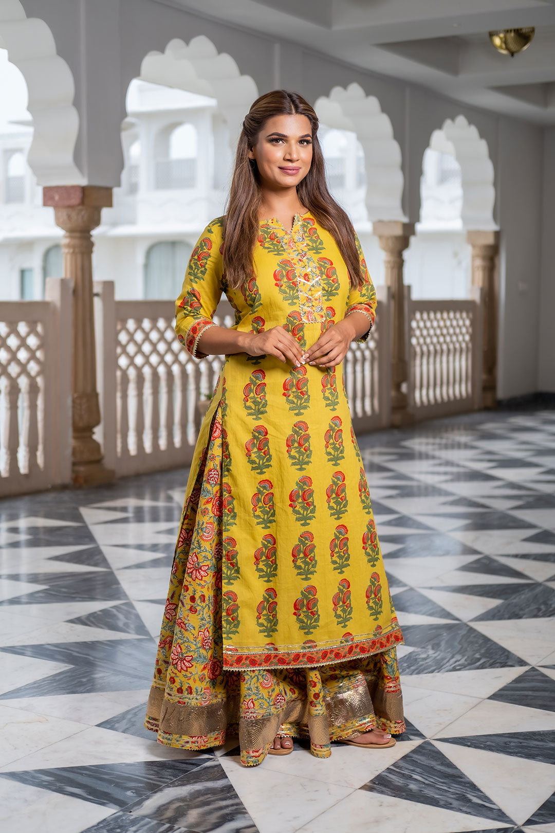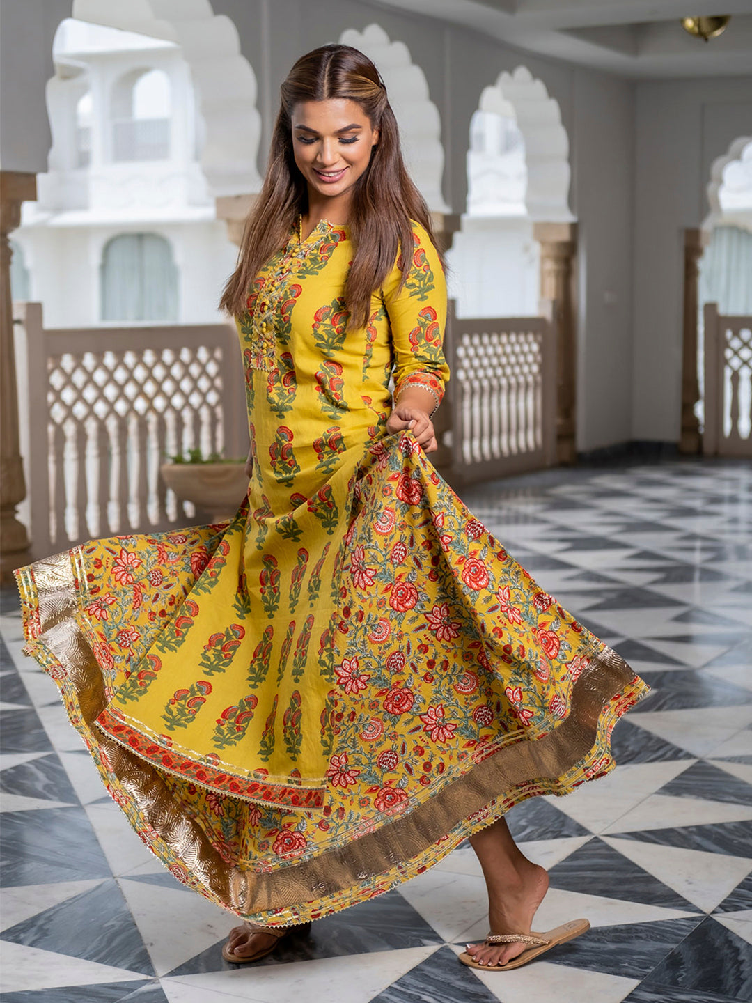 Mustard floral print straight kurta has a round neck and pocket on one side, gota lines and potli button at placket, three-quarter sleeves with fabric border and gota lace, side slits, straight hemline with fabric border and gota lace. Floral print cotton skirt with elastic at waist and gota lace at hemline.