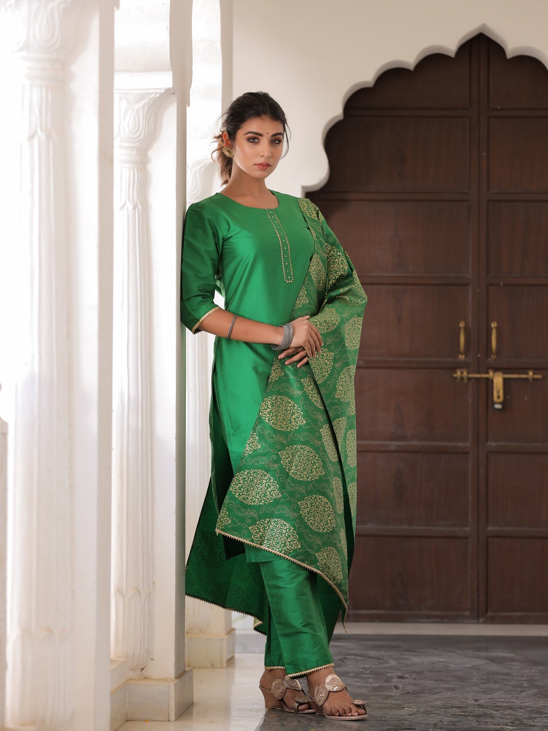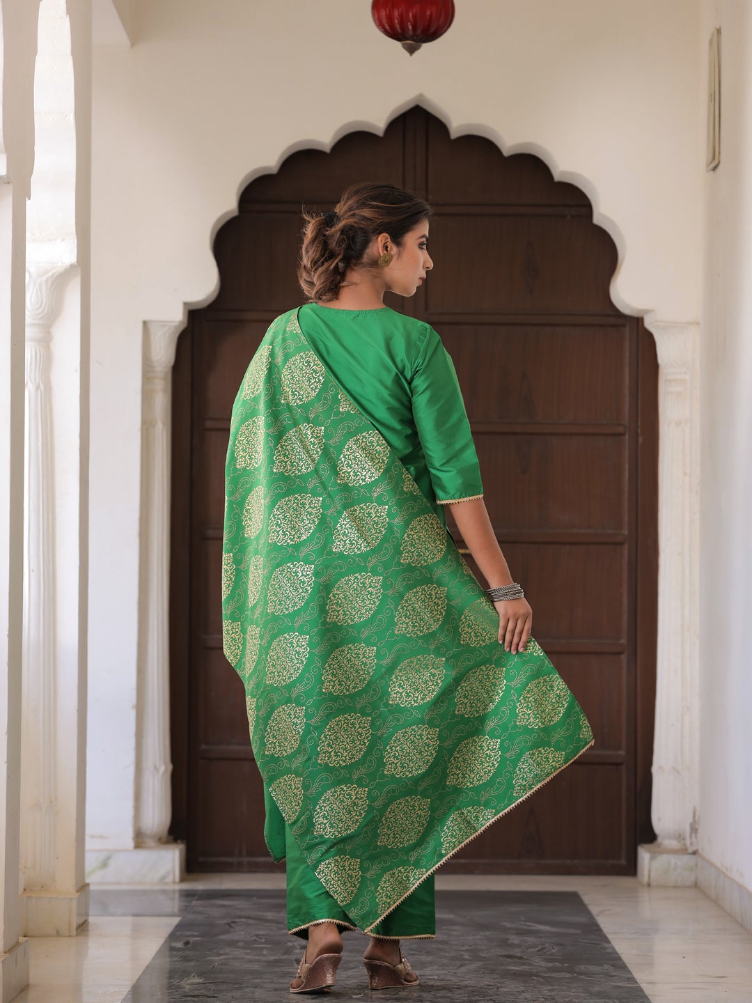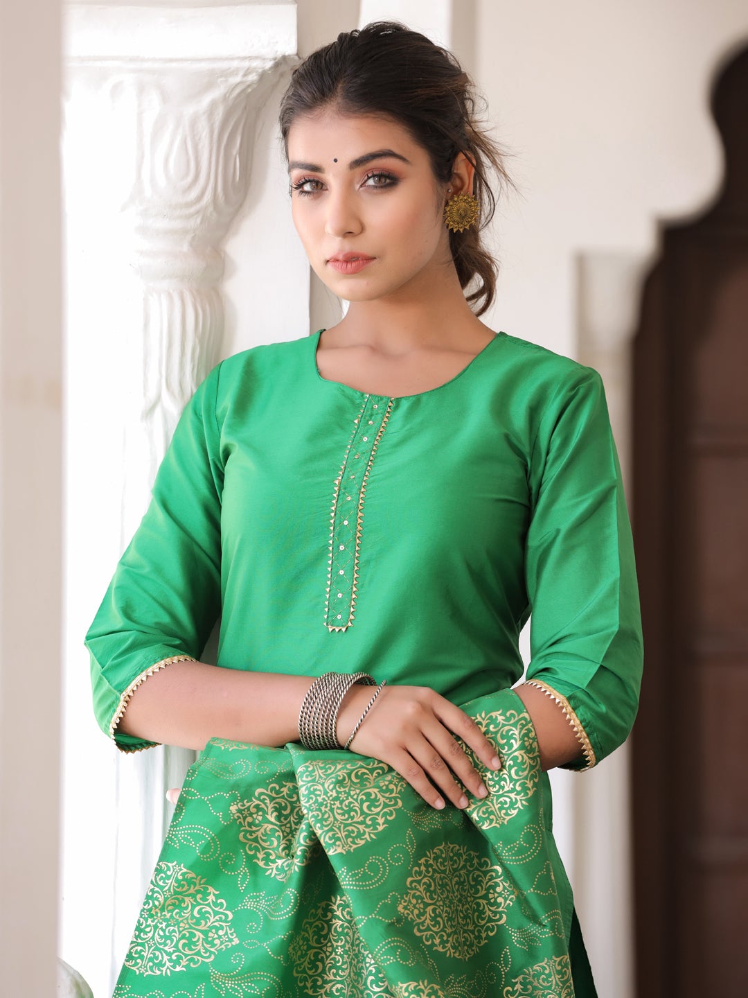 Green Solid Straight Kurta with Gotta work on Palazzo & Printed Dupatta
