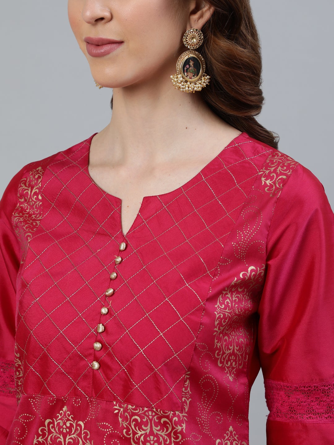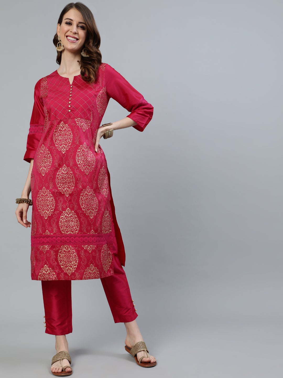 Pink printed Straight Kurta, round neck, thread work yoke with potli button detail, Three-Fourth Sleeve with lace insertion, Side Slits, Pink solid Pants, has Partially Elasticated Waistband, Slip-on Closure, Two Pockets