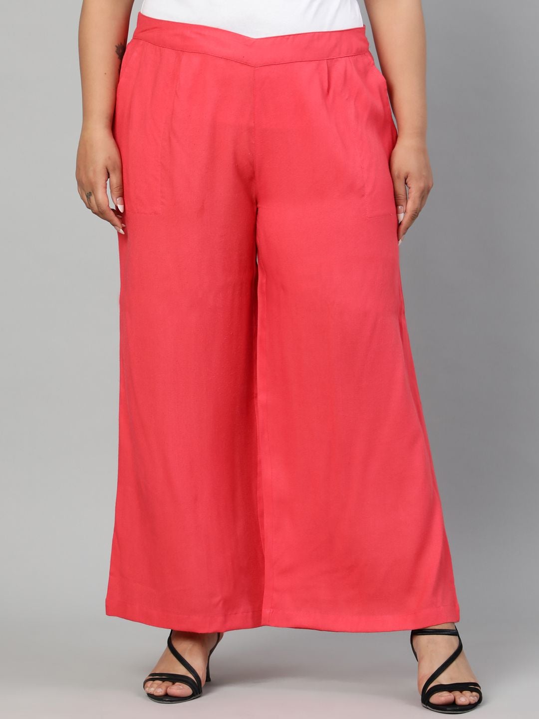 Coral Rayon Palazzo With Pleats Detailing On Front, 2 Side Pockets, Back Elastic.