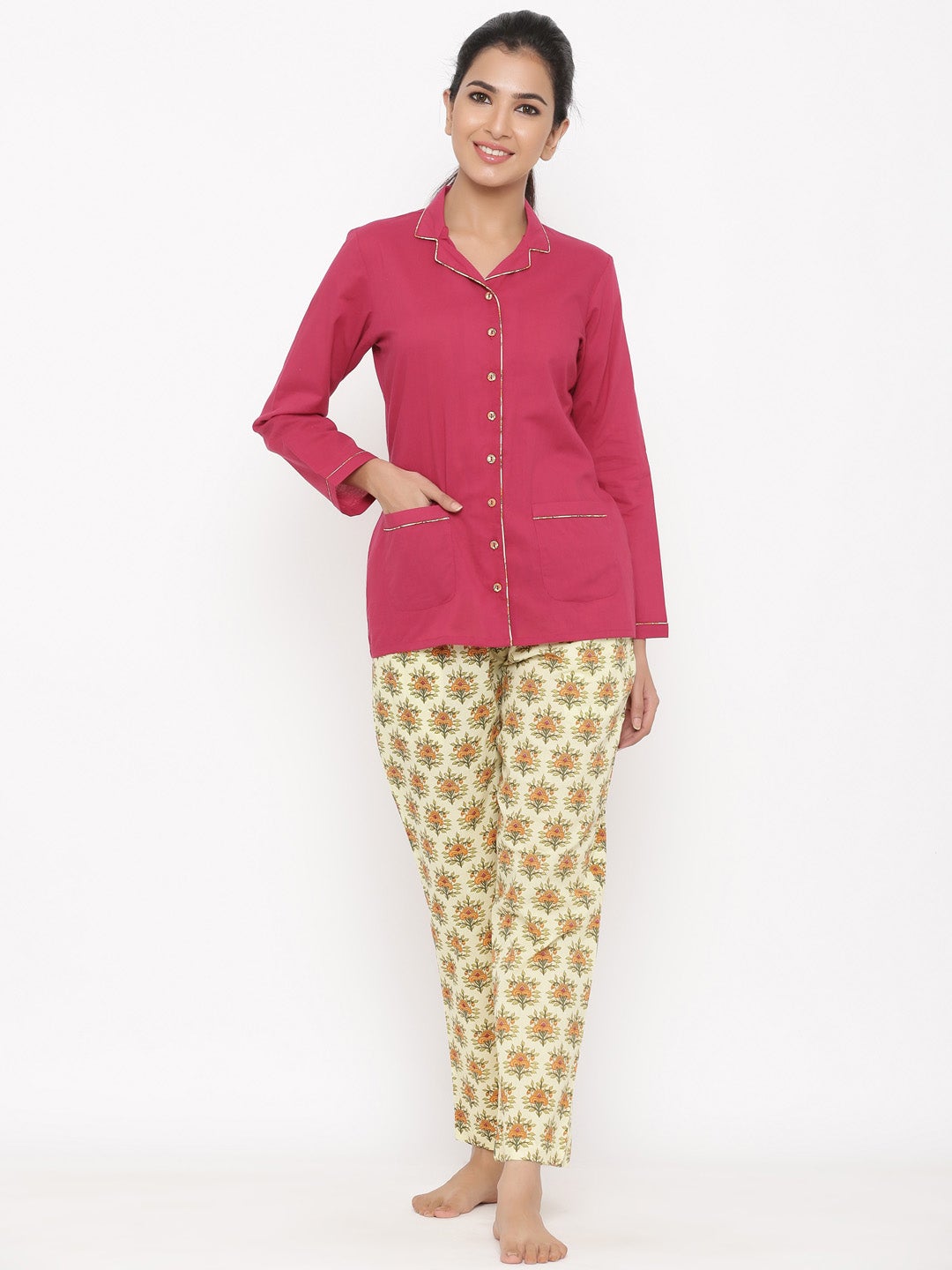 Magenta And Yellow Mughal Flower Printed Sleepwear Consists Of Shirt And Pyjamas Magenta Stripe Shirt Has A Lapel Collar, Pocket, Full Sleeve, Two Pockets In Front And Button Closure With Contrast Solid Pipin Detail A Pair Of Yellow Printed Pyjamas, Has A Inner Drawstring Closure And Elasticated Belt With Two Pockets