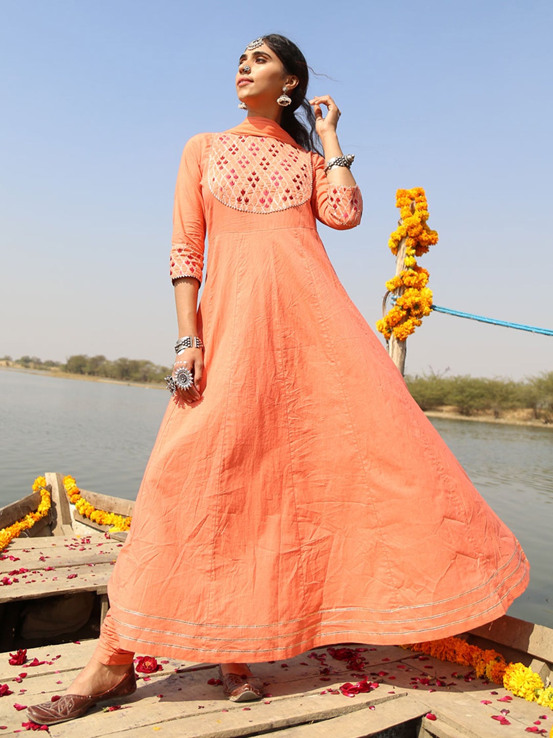 Peach Solid Anarkali Cotton Kurta With Churidar & Dupatta