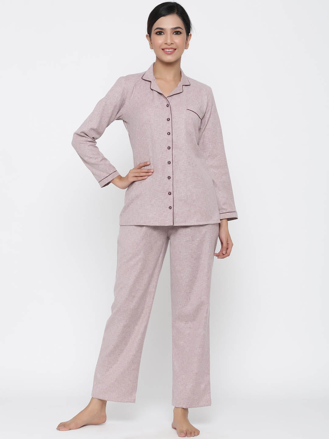 Pink Yarn Dyed Sleepwear Consists Of Shirt And Pyjamas Pink Yarn Dyed Shirt Has A Lapel Collar, Pocket, Full Sleeve, Button Closure With Contrast Solid Pipin Detail A Pair Of Pink Yarn Dyed Pyjamas, Has A Inner Drawstring Closure And Full Elasticated Belt With Two Side Pockets