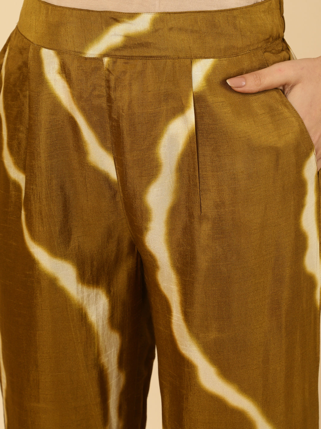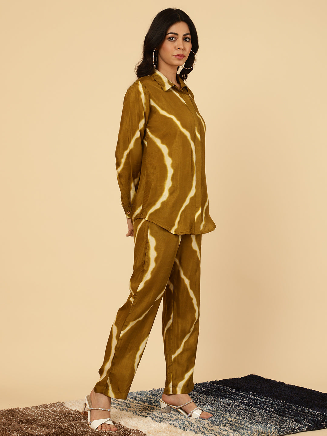 Have a relaxed outing in this Olive Green Lehriya Co-ord Set. The shirt has full sleeves and a front button placket and the pants are partially elasticated with side pockets.