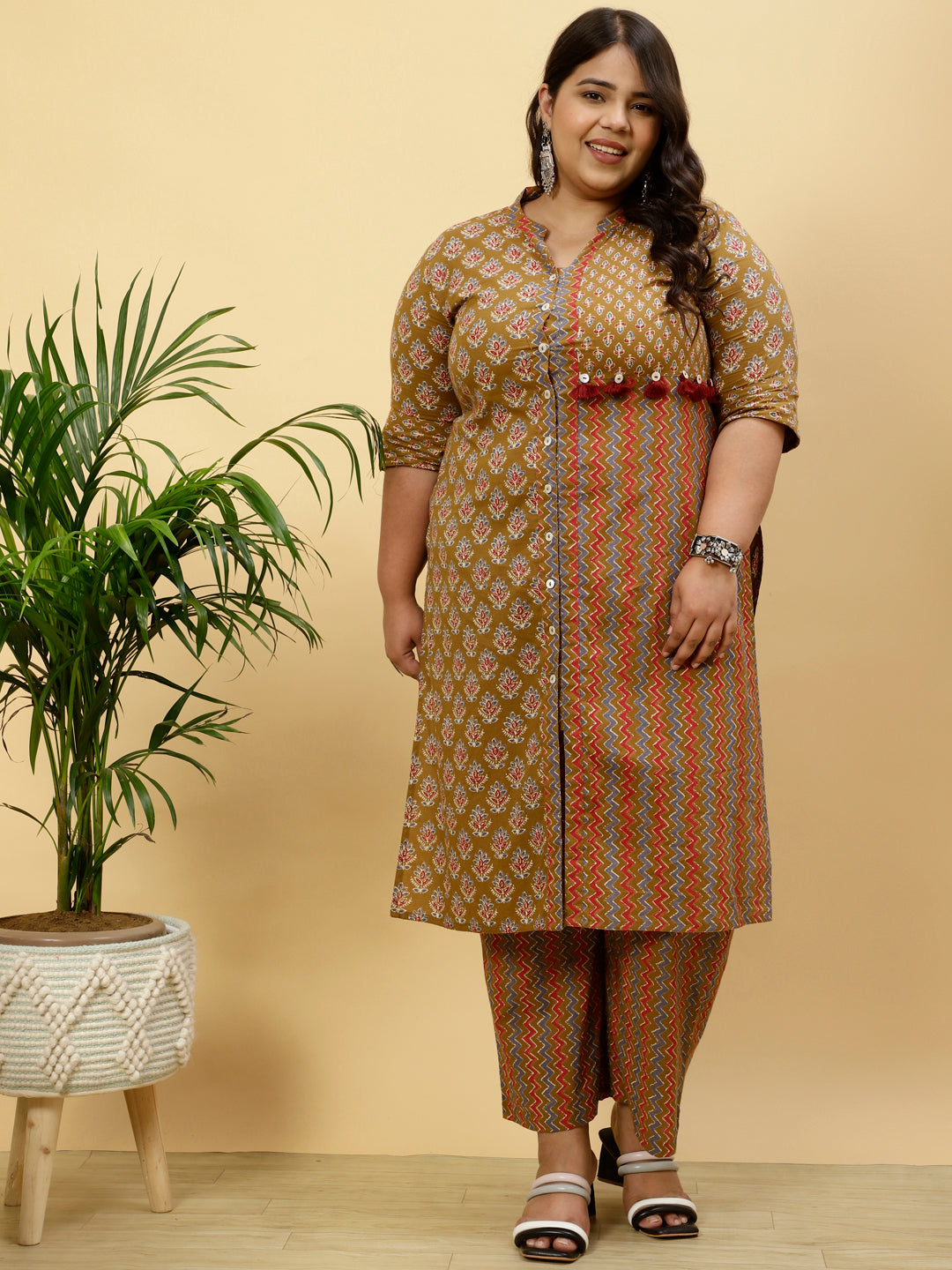 Plus Size Brown Ethnic Printed Straight Kurta With Pants