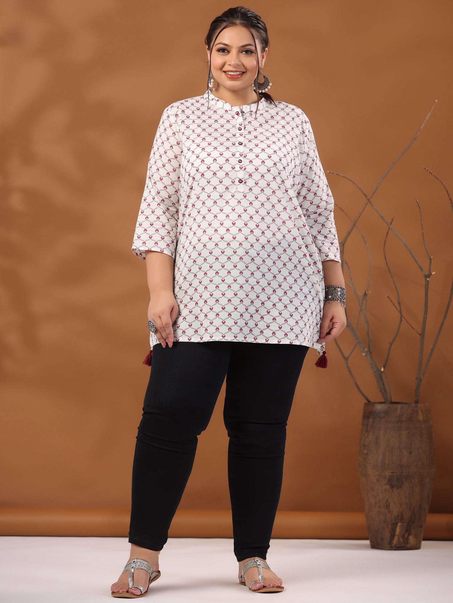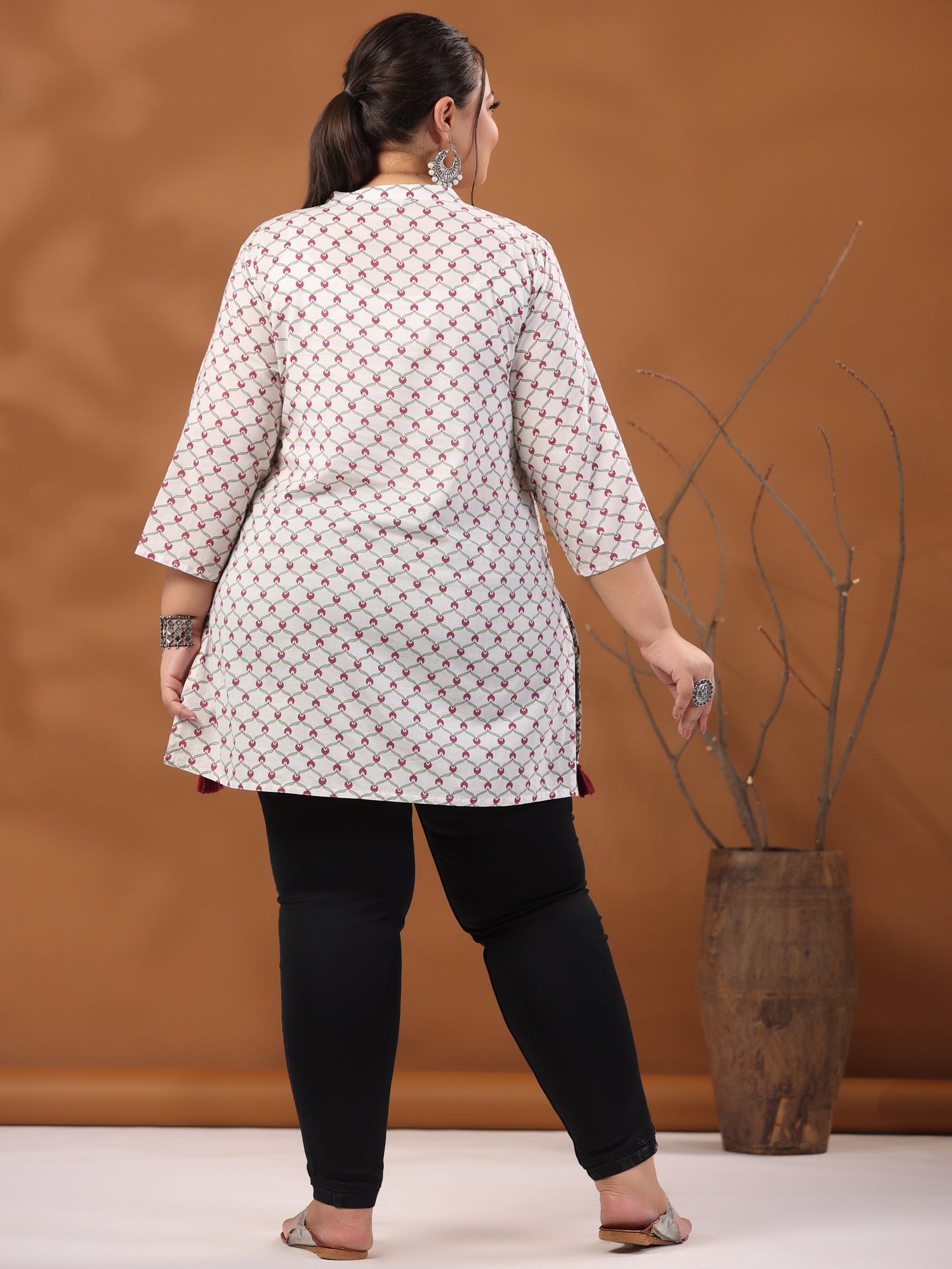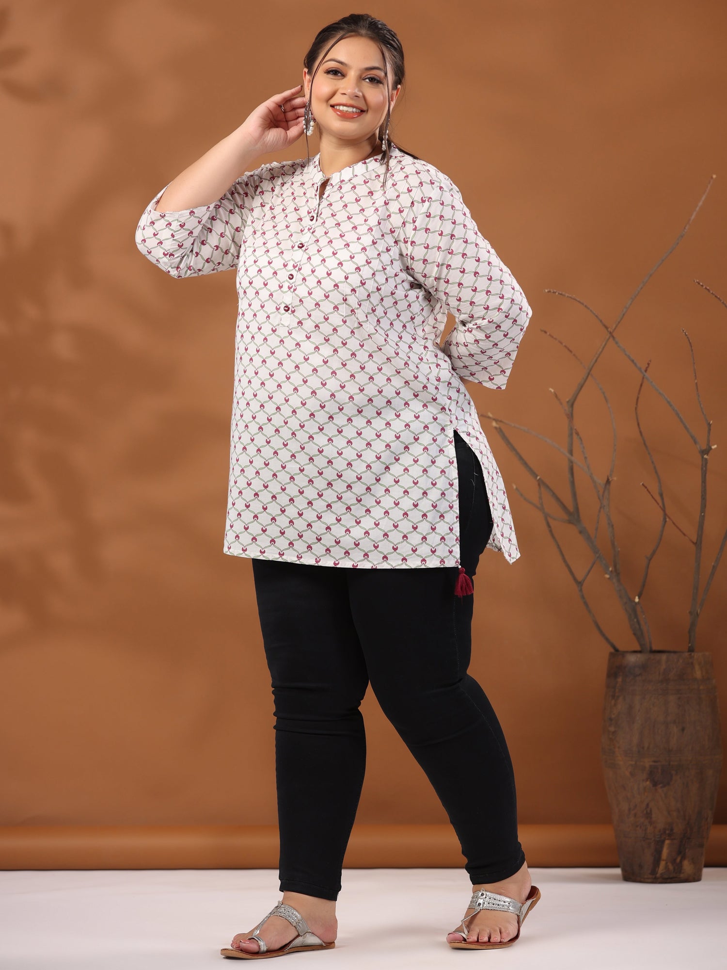 A blend of elegance and sophistication, this White plus-size cotton short kurta has magenta-colored geometric prints. It has a mandarin collar, three-fourth sleeves, a front button placket and a side high low slit
