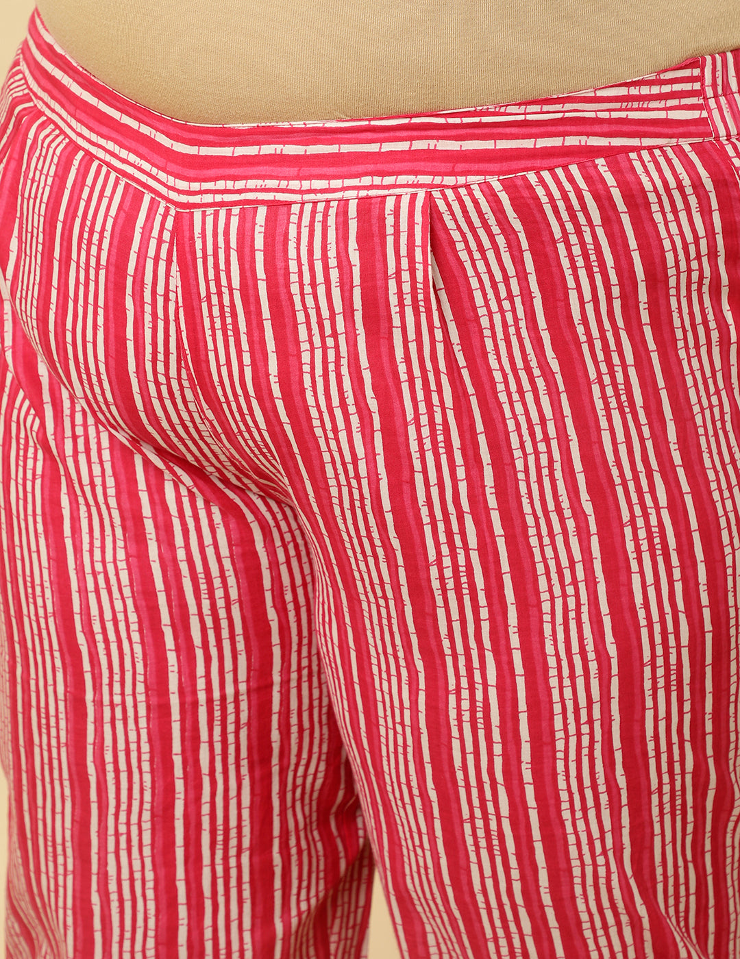 Introducing our Plus Size Pink Mirror Embellished Ikat Printed Suit Set, featuring a round neck, mirror work, & three-quarter sleeves. Paired with partially elasticated pants and printed dupatta.