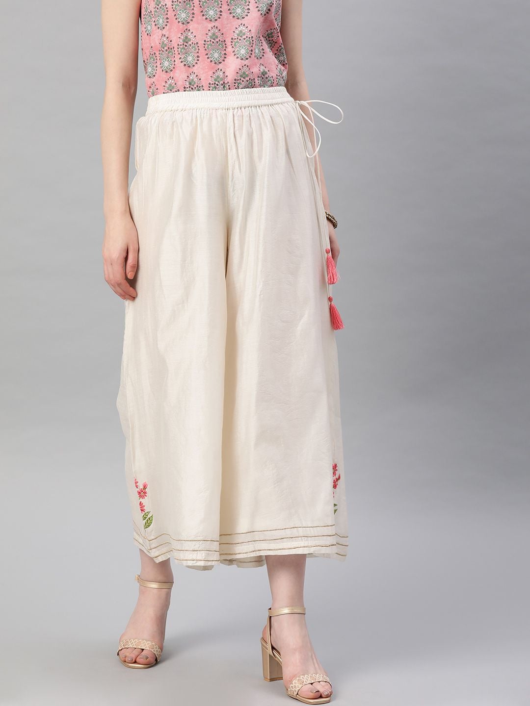 White Chanderi Flared Palazzo With Placement Embroidery Detailing At Hemline Along With Zari Border, Dori With Tassels Detailing, All Over Elastic.
